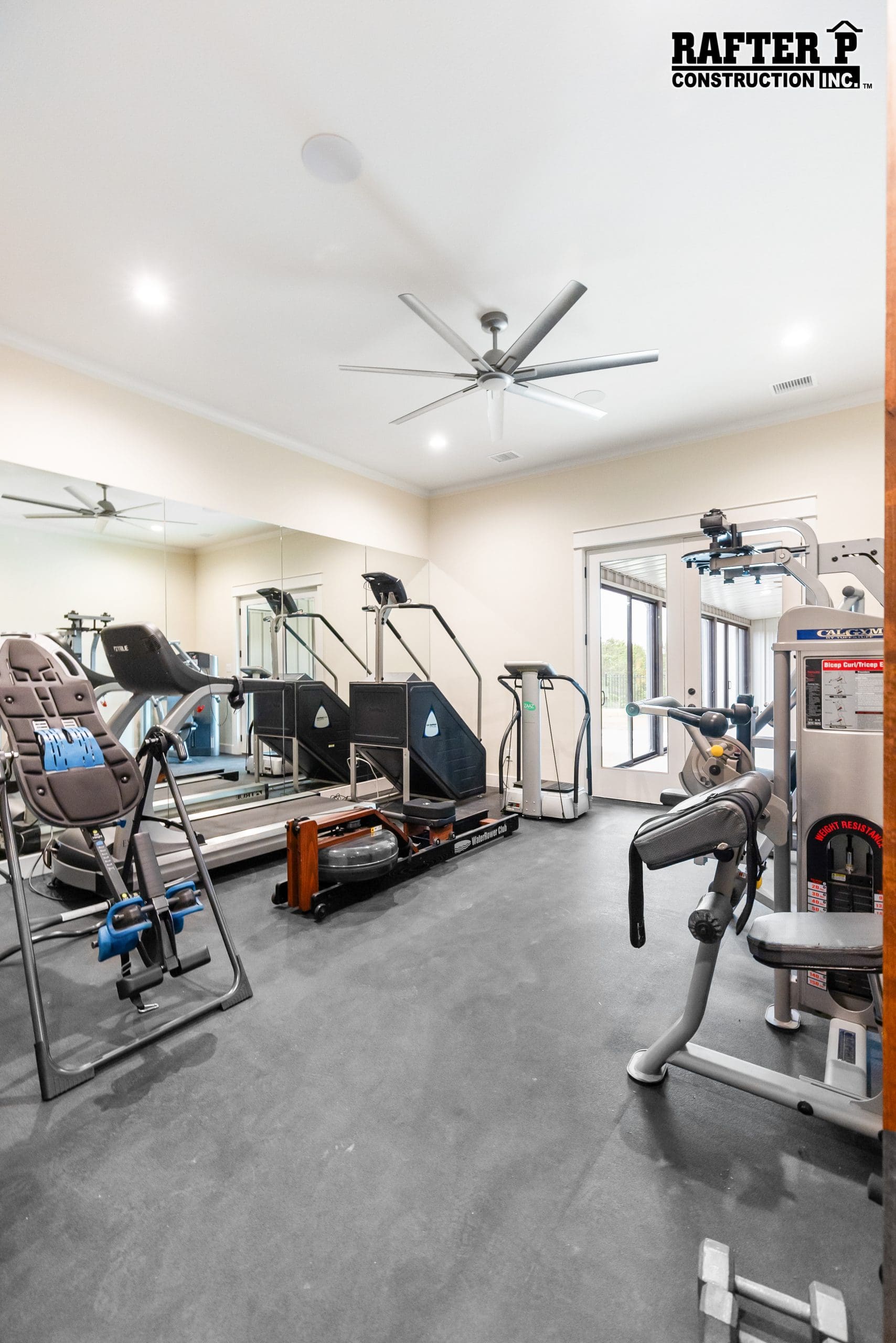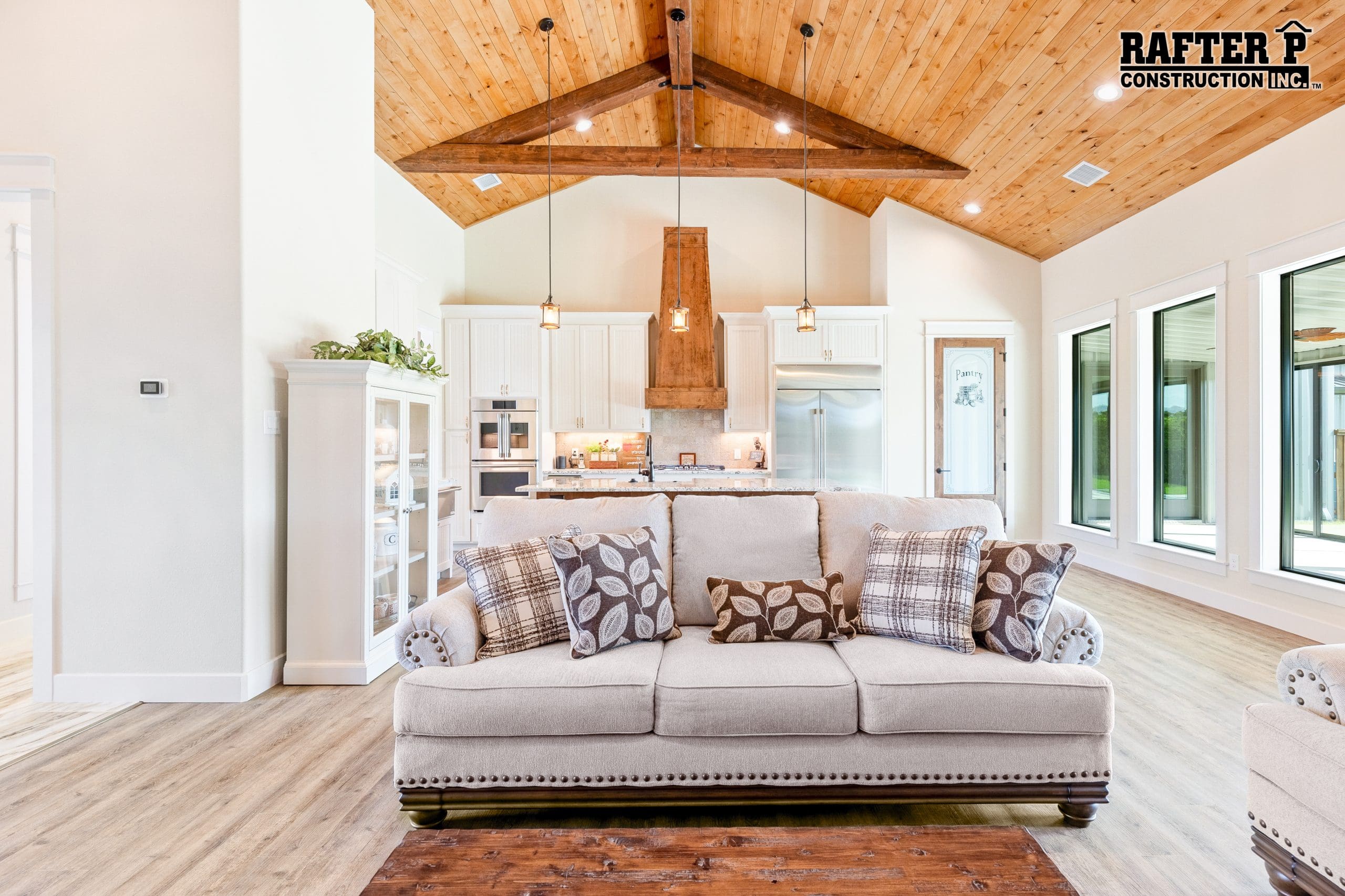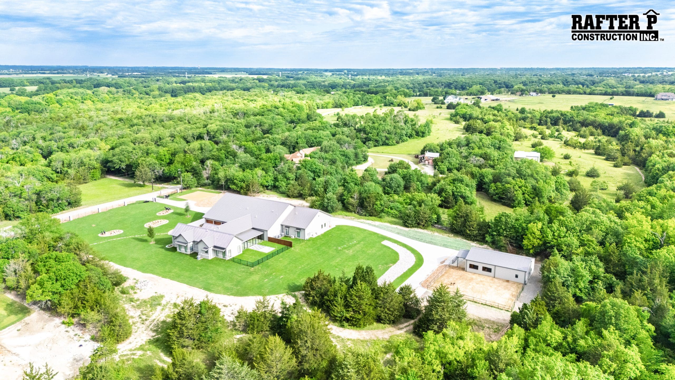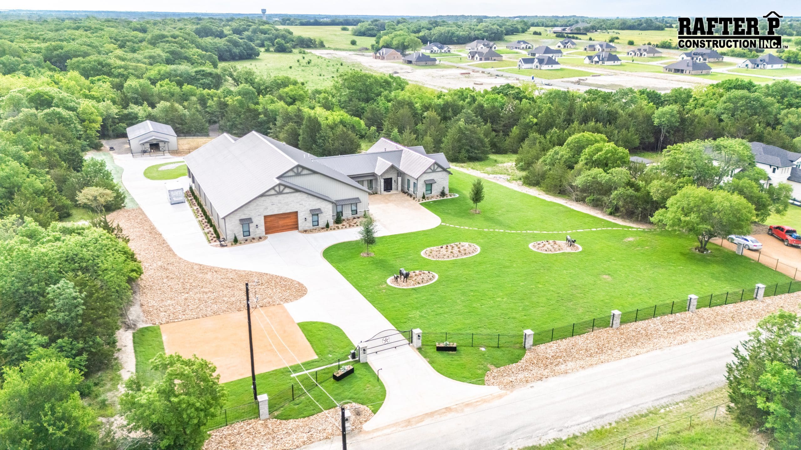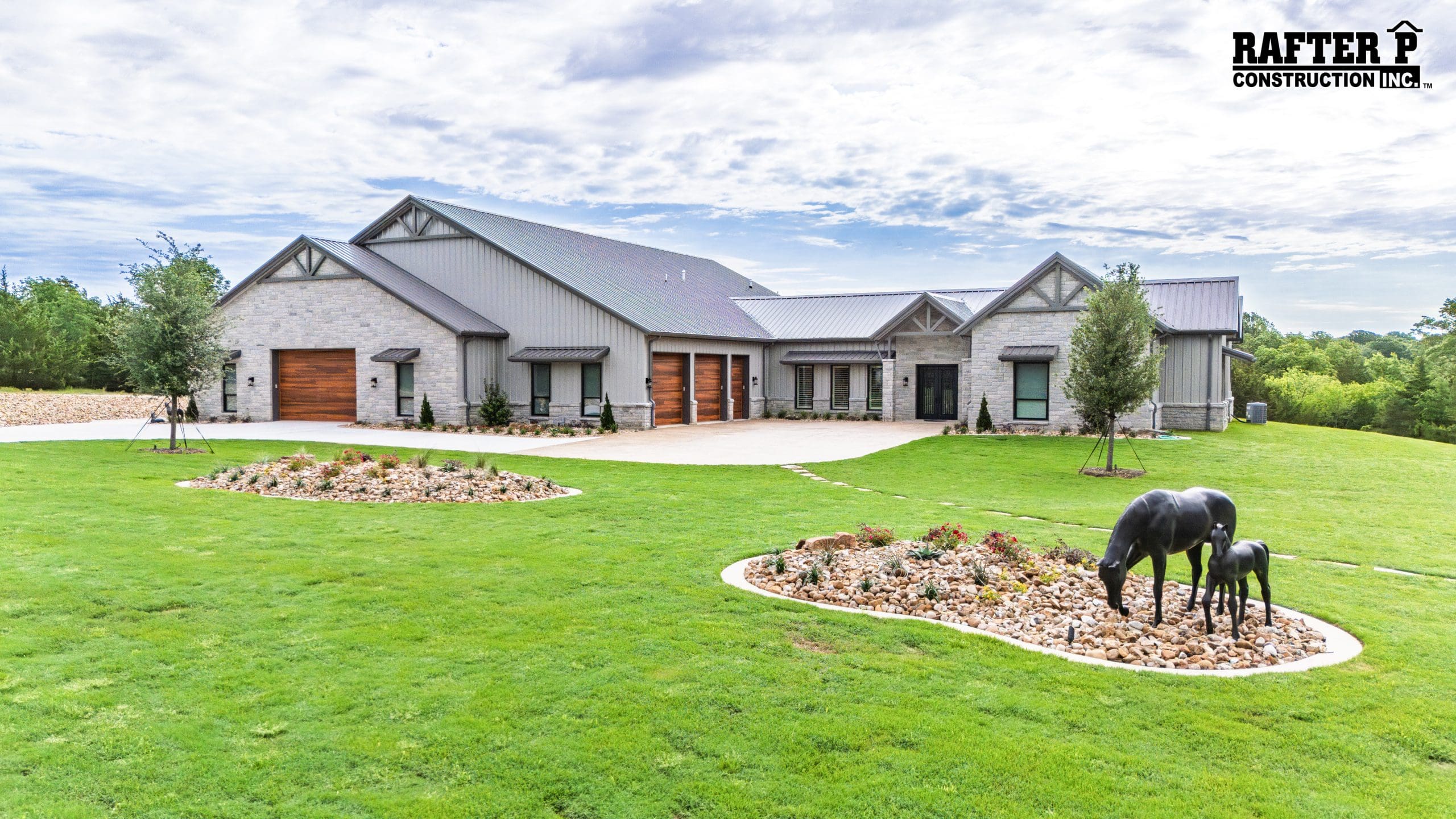 The Antique Alley Barndo is an extraordinary custom construction that encompasses over 11,600 square feet beneath its roof. This remarkable property also features a 2,144 square foot horse barn and exquisite landscaping. The residence boasts 10,126 square feet of air-conditioned space, comprising 3 bedrooms, 3 ½ baths, an event center, gym, office, custom barn area, and a workshop. The exterior is adorned with light gray walls complemented by a charcoal roof and trim, full masonry walls with 3’ wainscoting, and bespoke wooden overhead doors. The entire site is a testament to fine landscaping, showcasing a color-patterned concrete driveway, a custom entrance with stone-wrapped columns, fencing, paddock fencing, site lighting, decorative gravel, and irrigation, all meticulously crafted by Rafter P. This home was designed with the custom car barn and workshop area in mind, featuring numerous rustic elements such as a barnwood wall, tiki brown polyaspartic flooring, a linear panel ceiling, exposed spiral ducting, car lifts, gauged steel walls, and custom decorative lighting. Upon entering the home, the foyer presents double rod iron doors that lead into a stunning marble tile area that transitions into LVP flooring. The kitchen and living space are highlighted by a vaulted ceiling adorned with knotty alder shiplap, rustic beams, a 36” gas fireplace with a masonry surround, custom cabinetry, a walk-in pantry, and granite countertops. The master bedroom is equally impressive, featuring a 36” gas fireplace and a secret room concealed by knotty alder shiplap. In the master bathroom, one can admire a bronze clawfoot tub positioned against a masonry wall, a walk-in shower, double vanities, and his and her closets with custom-built glass insert cabinets. One of the guest rooms showcases a knotty alder shiplap wall and its own bathroom, earning it the title of the western room. The other guest room embraces a beach theme, complete with its own bathroom as well. This residence is equipped with its own gym, office, and event space. The event area features a barnwood wall, LVP flooring, a 16’ sliding glass door, and a bar/ice cream area, making it ideal for hosting large gatherings or simply unwinding while watching a movie. The screened-in porch offers a stunning view of the exquisite landscaping, and the Rafter P constructed horse barn, which is home to cherished mini horses. This barn is equipped with four stalls, a tack room, and a dedicated equipment/work area. This bespoke residence serves as an ideal sanctuary for pursuing your passions while basking in the breathtaking surroundings.