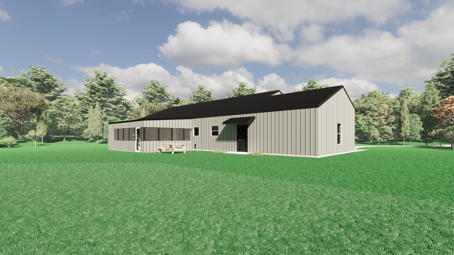 The “Eagles Nest Barndo” is a unique 3-bedroom, 2.5-bathroom home with an office, dining room, and attached garage, totaling 3,789 square feet under the roof. The exterior of this residence showcases bright white walls, a black roof, and black trim, complemented by a spacious front porch. Inside, you will find stained concrete floors, vaulted ceilings in the foyer, kitchen, and living area, and 8-foot ceilings in the bedrooms and bathrooms. The kitchen boasts custom paint-grade cabinetry, a tin-style tile backsplash, granite countertops, an oversized island with seating, and a custom-built armoire. Notable design elements include an entry accent wall with hooks, a granite countertop and hanging rod in the laundry room for folding clothes, a generous master bath with a clawfoot tub, and ADA doorways. This delightful barndominium is perfect for a family seeking a peaceful countryside lifestyle.